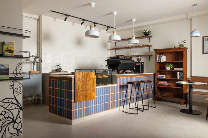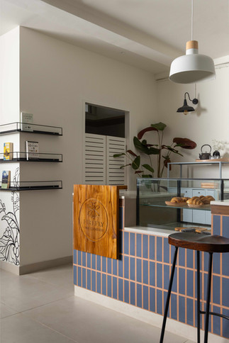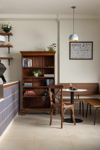 The design embraces simplicity. Neutral walls, warm wooden furniture, and soft lighting create a calm backdrop, allowing the textures and materials to quietly define the space. The tiled coffee counter introduces a subtle contrast, balancing modern design with handcrafted warmth.